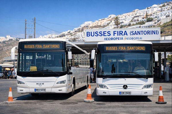 Ja – Fira ist das Zentrum des öffentlichen Busverkehrs auf Santorini. Alle Busse werden von KTEL Santorini betrieben. Der Busbahnhof Fira liegt zentral in der Innenstadt, nur wenige Gehminuten vom Kraterrand und den Seilbahnen zum Hafen entfernt.
